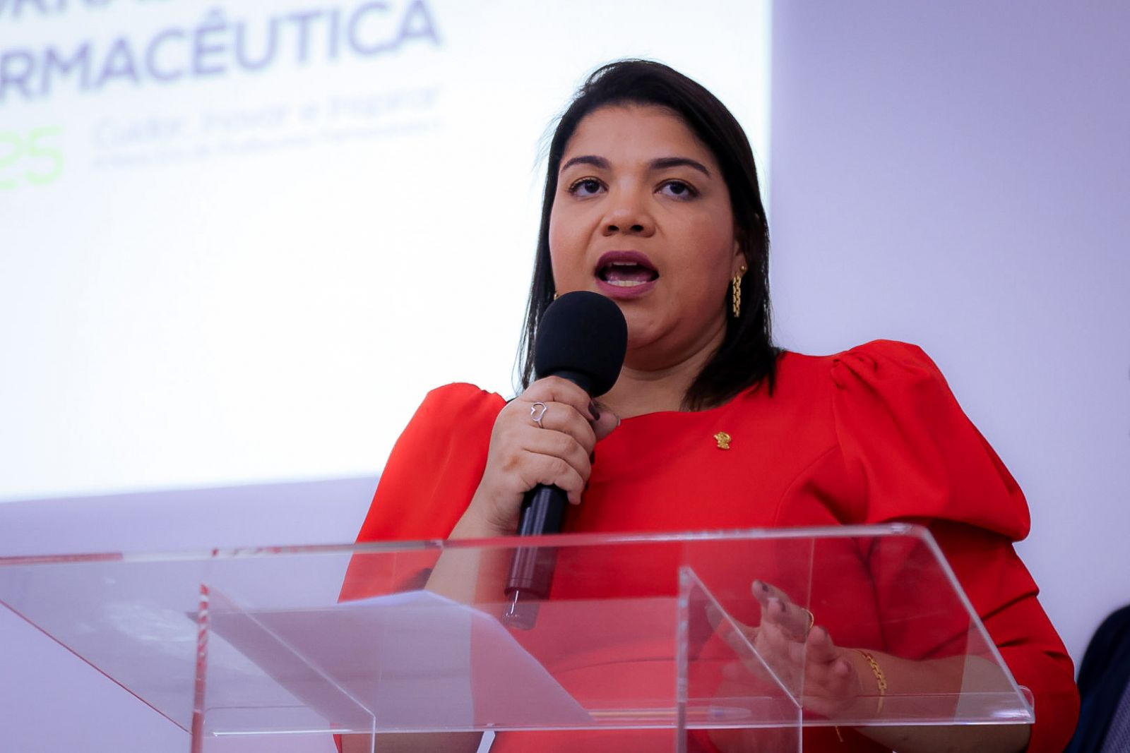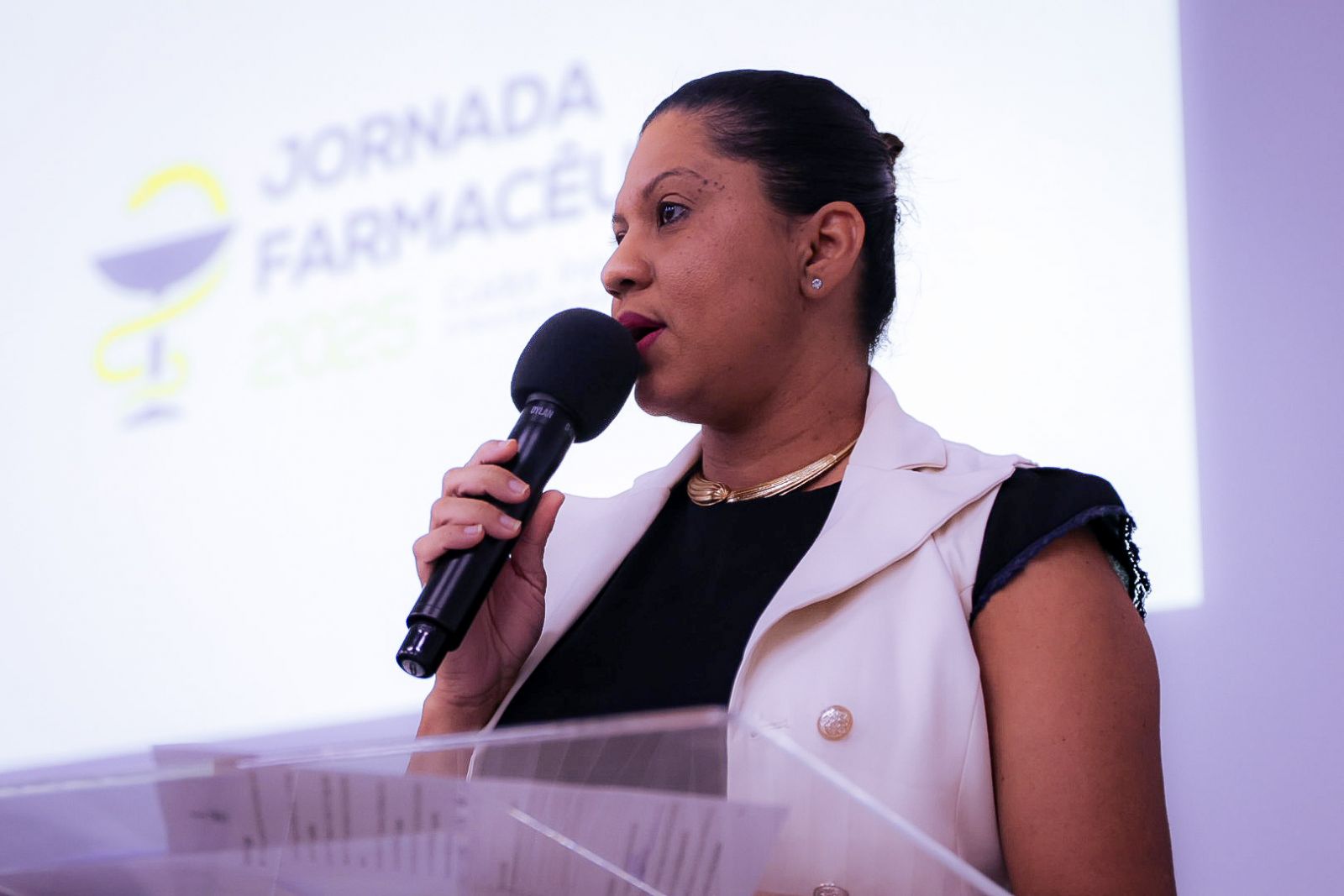 Lima falou aos presentes sobre “Conectar, Cuidar, Criar: a jornada do farmacêutico na era da saúde inteligente”.