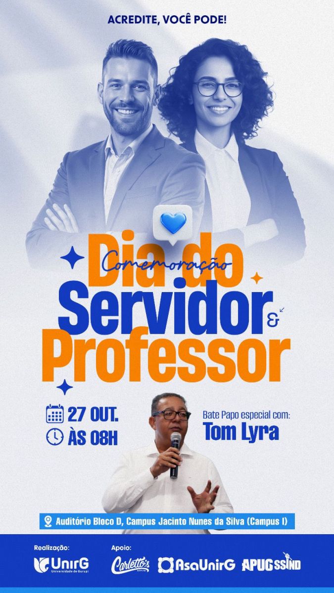 Em homenagem ao Dia do Servidor Público e ao Dia do Professor, a Universidade de Gurupi – UnirG realizará, na próxima segunda-feira, 27, às 8h, um evento especial voltado aos servidores e professores da Instituição. A programação acontecerá no auditório do bloco D, no campus Jacinto Nunes da Silva, e contará com um bate-papo com o empresário e ex-secretário de Indústria, Comércio e Serviços do Tocantins, Tom Lyra.