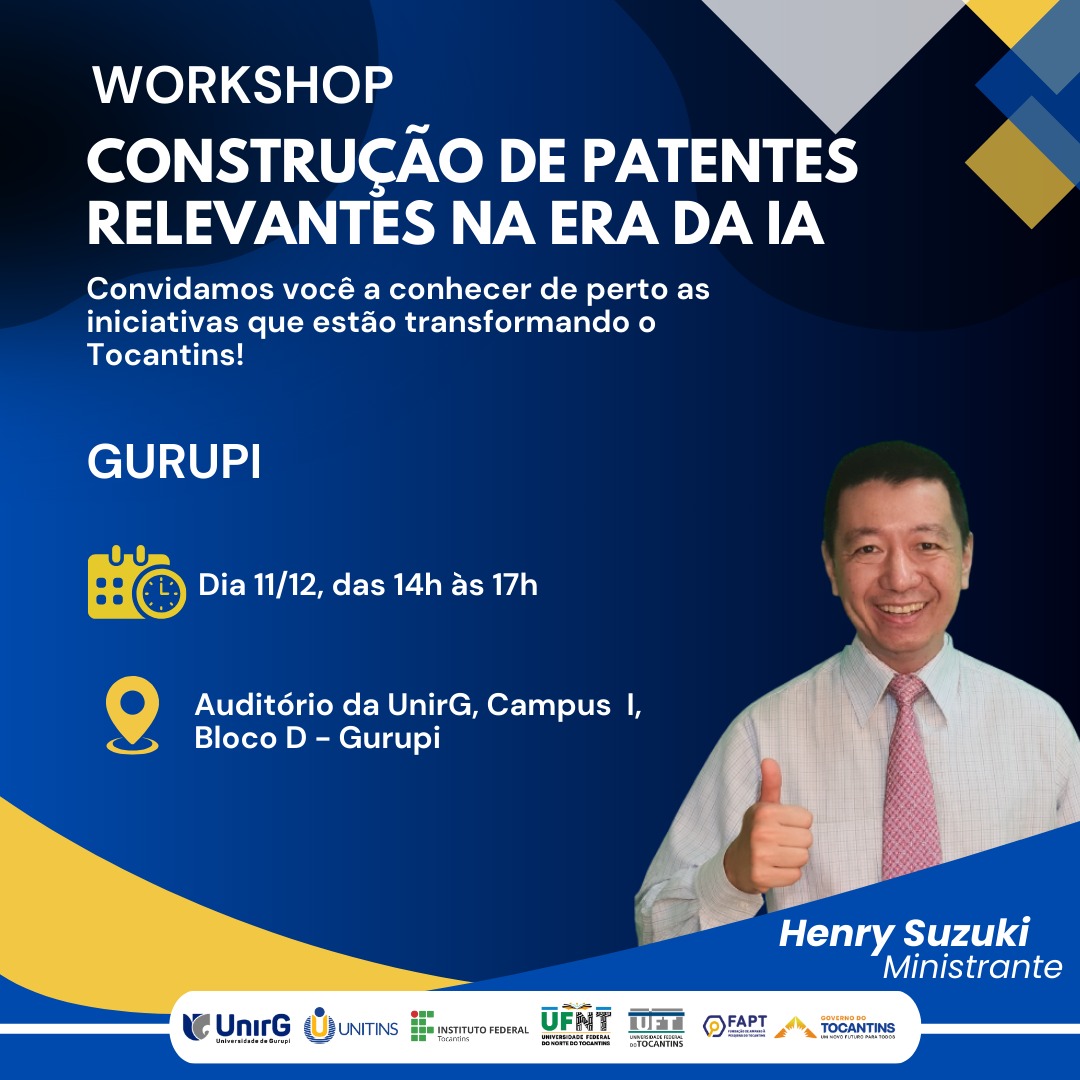 O Workshop “Construção de patentes relevantes na era da IA”, é promovido pela Fundação de Amparo à Pesquisa do Tocantins (FAPT) para Rede Deser via Centro de Desenvolvimento Regional (CDR Sul/TO)/Rede Deser, em parceria com a Universidade de Gurupi - UnirG, Universidade Estadual do Tocantins - Unitins, Instituto Federal do Tocantins - IFTO, Universidade Federal do Norte do Tocantins  - UFNT e Universidade Federal do Tocantins – UFT.