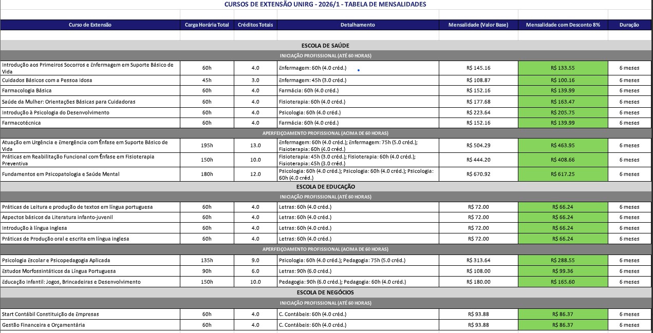 Os interessados poderão se inscrever de 15 de dezembro a 18 de janeiro de 2026, por meio do endereço www.unirg.edu.br, em link que estará disponível na aba Extensão.
