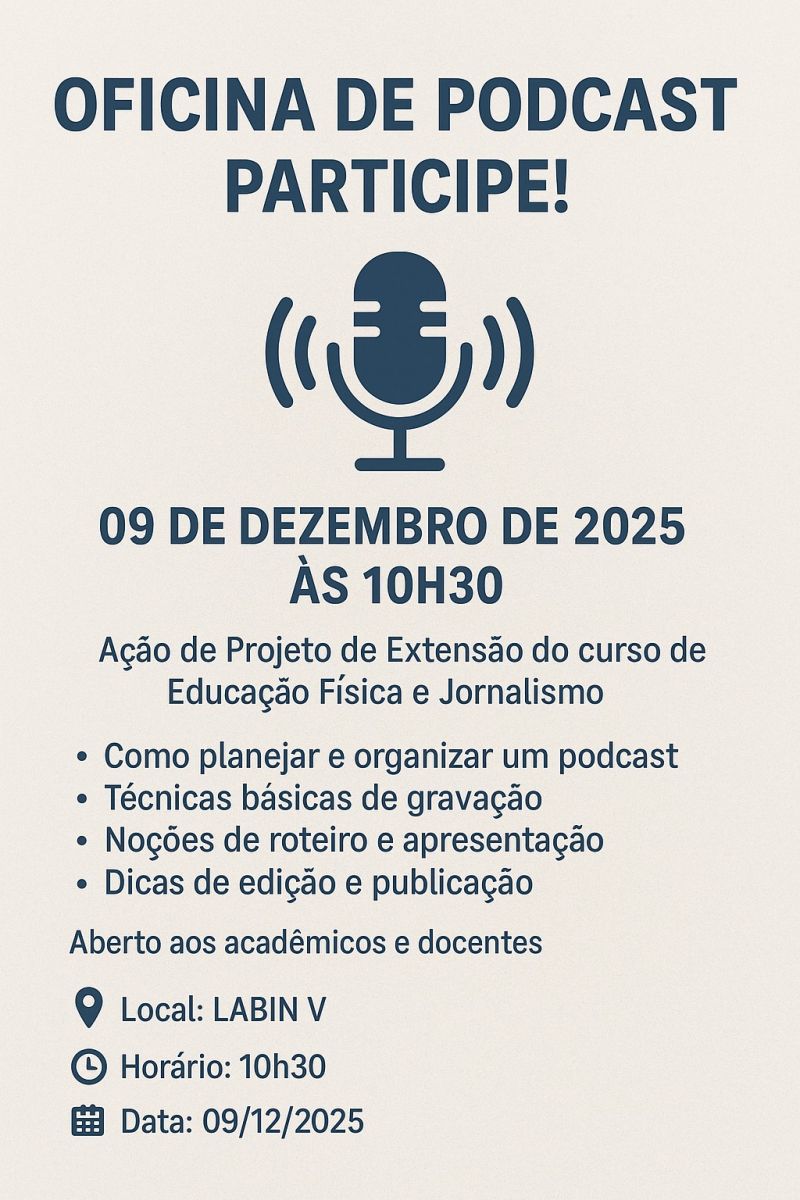 Com o intuito de fomentar a produção de conteúdo no ambiente acadêmico, os cursos de Educação Física e Jornalismo da Universidade de Gurupi - UnirG, irão promover na próxima terça-feira, 09, uma oficina de podcast. O evento será realizado no Labin V, campus II, às 10h30.