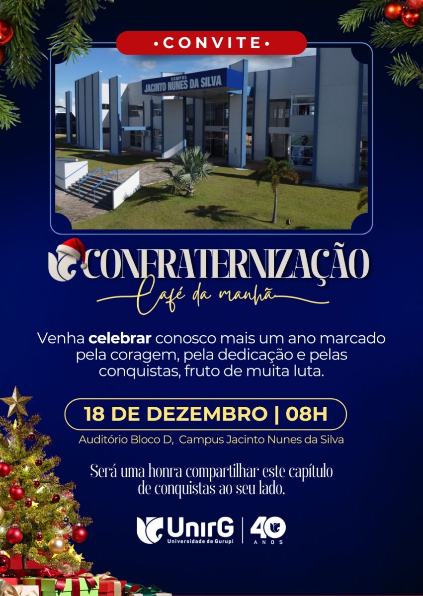 A Fundação UnirG e a Universidade de Gurupi - UnirG promoverão na próxima quinta-feira, 18, uma confraternização “Café da Manhã com Servidores”, reunindo técnico-administrativos e professores da Instituição. O encontro será realizado a partir das 08h, no auditório do bloco “D”, no campus Jacinto Nunes da Silva.