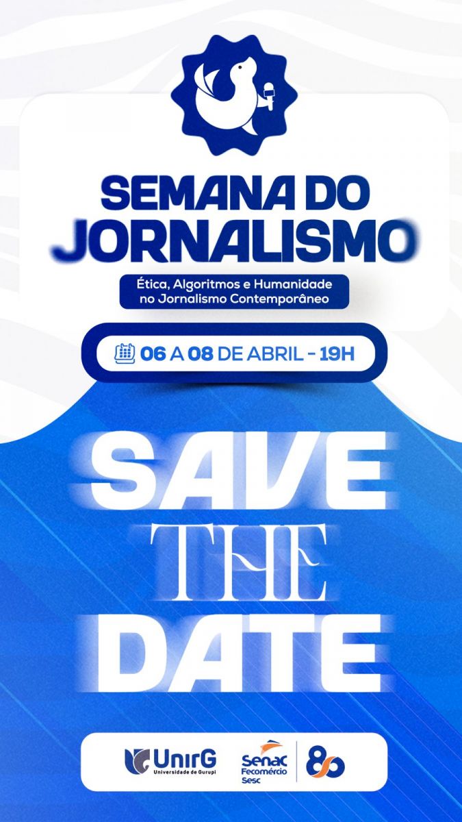 Evento será realizado no auditório do Senac, com entrada solidária de 1Kg de alimento não perecível Entre os dias 06 e 08 de abril, a Universidade de Gurupi - UnirG promove a Semana do Jornalista, com o tema “Conexões Necessárias: Ética, Algoritmos e Humanidade no Jornalismo...