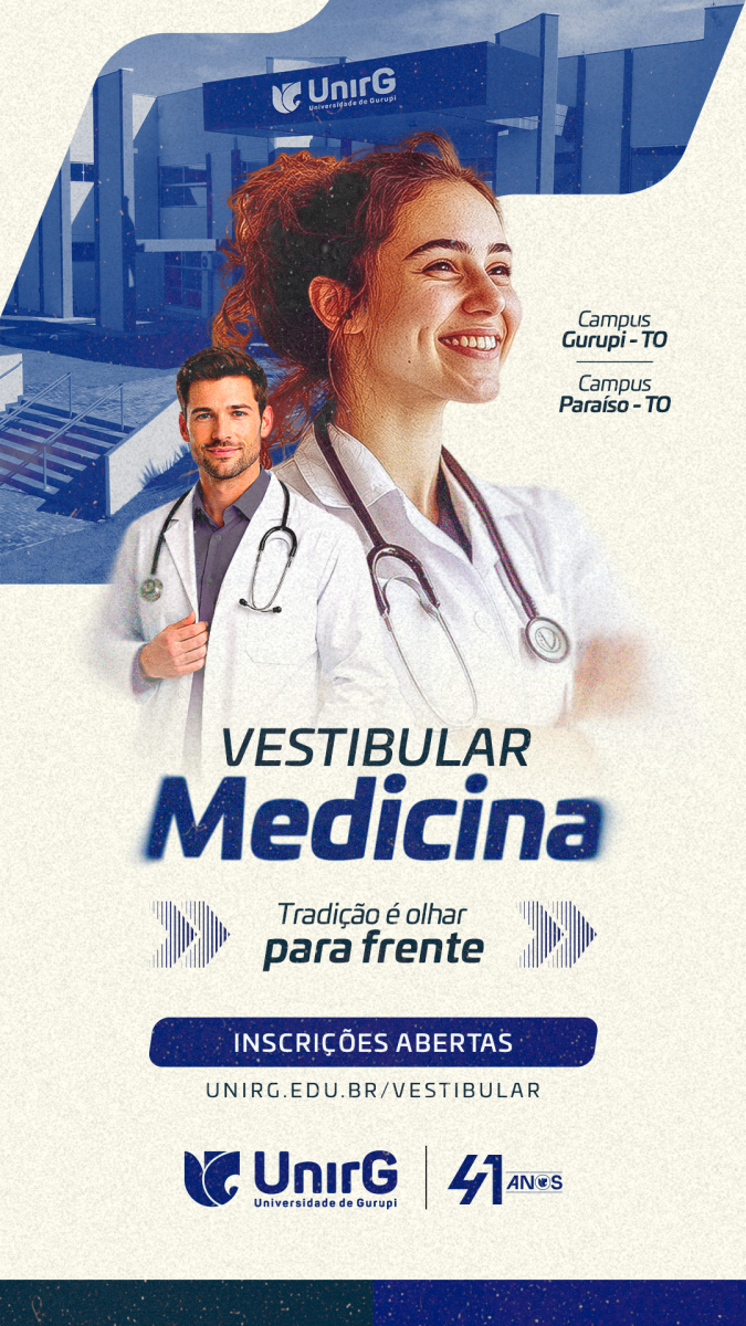 Estão abertas as inscrições para o processo seletivo do curso de Medicina, para o segundo semestre de 2026, da Universidade de Gurupi - UnirG. O prazo segue até 29 de abril, pelo endereço unirg.edu.br/vestibular.