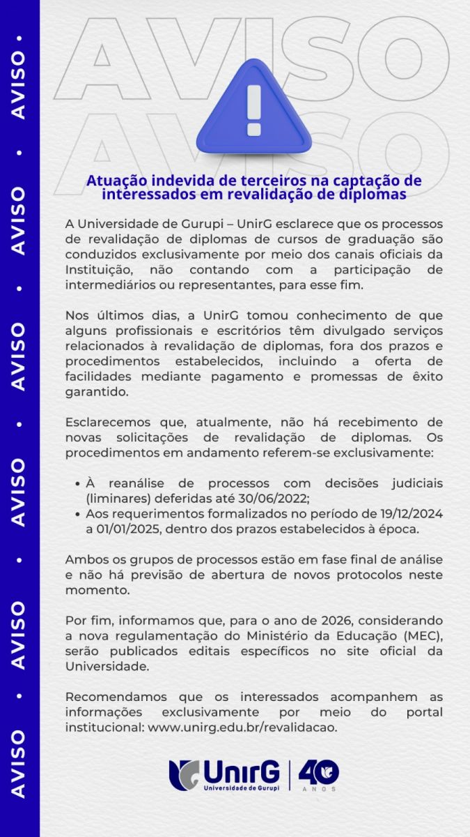 Em tempo, informamos que a UnirG não disponibiliza procedimento para revalidação de diplomas de graduação pela via simplificada e que tal procedimento não integra os projetos institucionais.