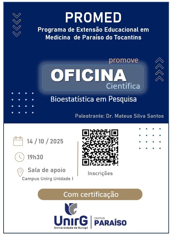 Leia mais... keyboard_arrow_rightEstão abertas as inscrições para a oficina científica “Bioestatística em Pesquisa”, que será realizada no dia 14 de outubro, às 19h30, na sala de apoio do campus de Paraíso da Universidade de Gurupi - UnirG.