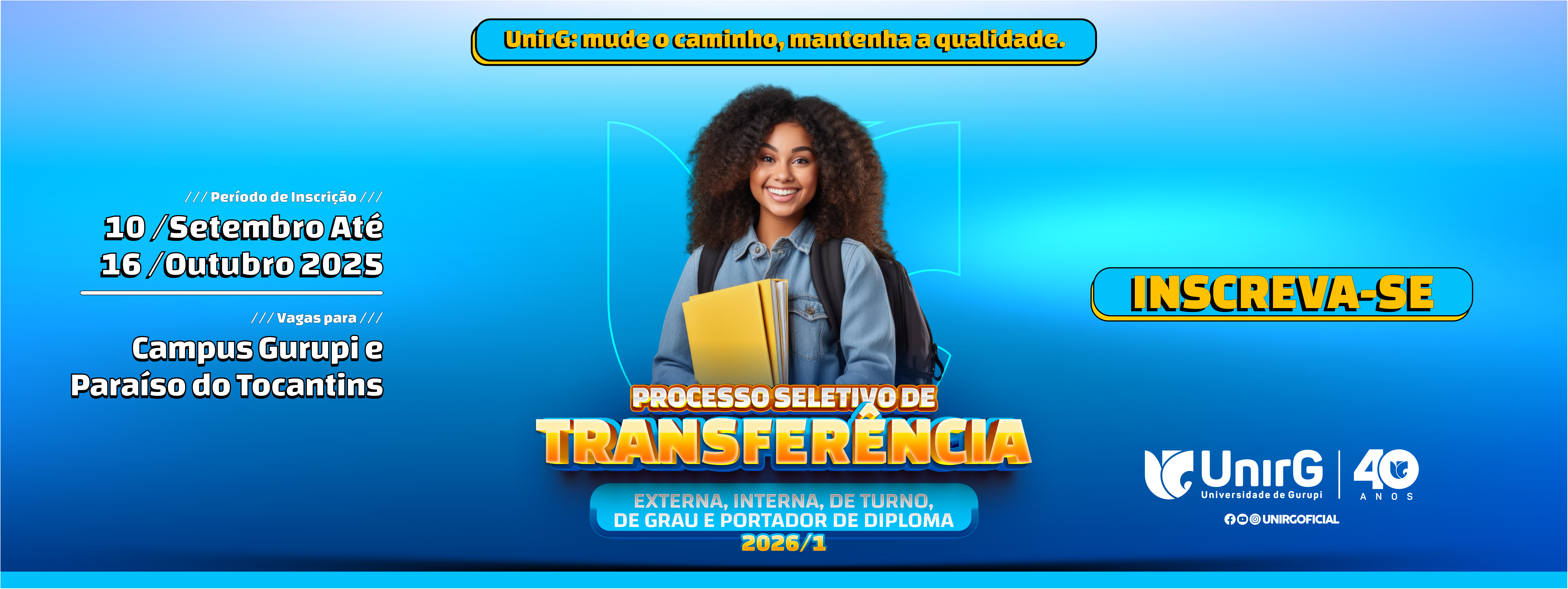 Tudo bem, nós temos o processo seletivo de Transferências e de Portador de Diploma. Ele é realizado a cada semestre e a abertura das inscrições, geralmente, ocorre em abril e em setembro.